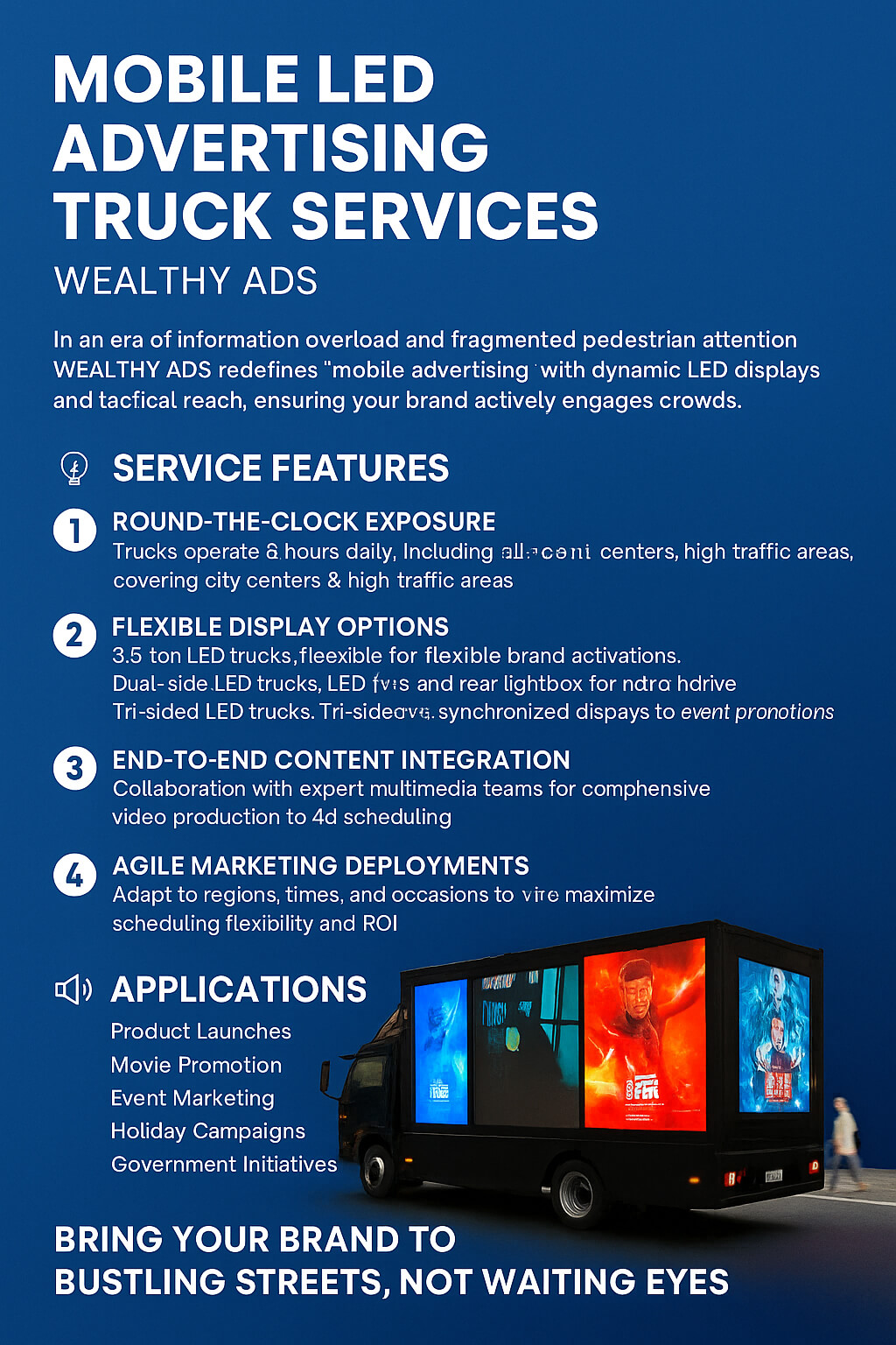 在資訊爆炸、行人注意力碎片化的時代,WEALTHY ADS 影音廣告車以高動態 LED 顯示技術與機動投放優勢,重新定義「行動廣告」的新標準。